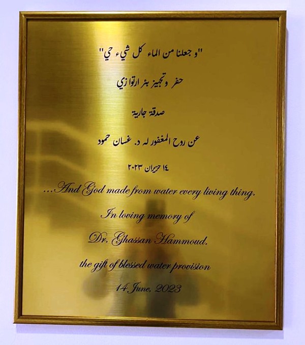 وقد جرى الإعلان عن المبادرة بلوحة رفعت في "مبنى مستشفى دار السلام" جاء فيها : "وجعلنا من الماء كل شيء حي " .. حفر وتجهيز بئر ارتوازية صدقة جارية عن روح المغفور له الدكتور غسان حمود - 14 حزيران 2023 ".