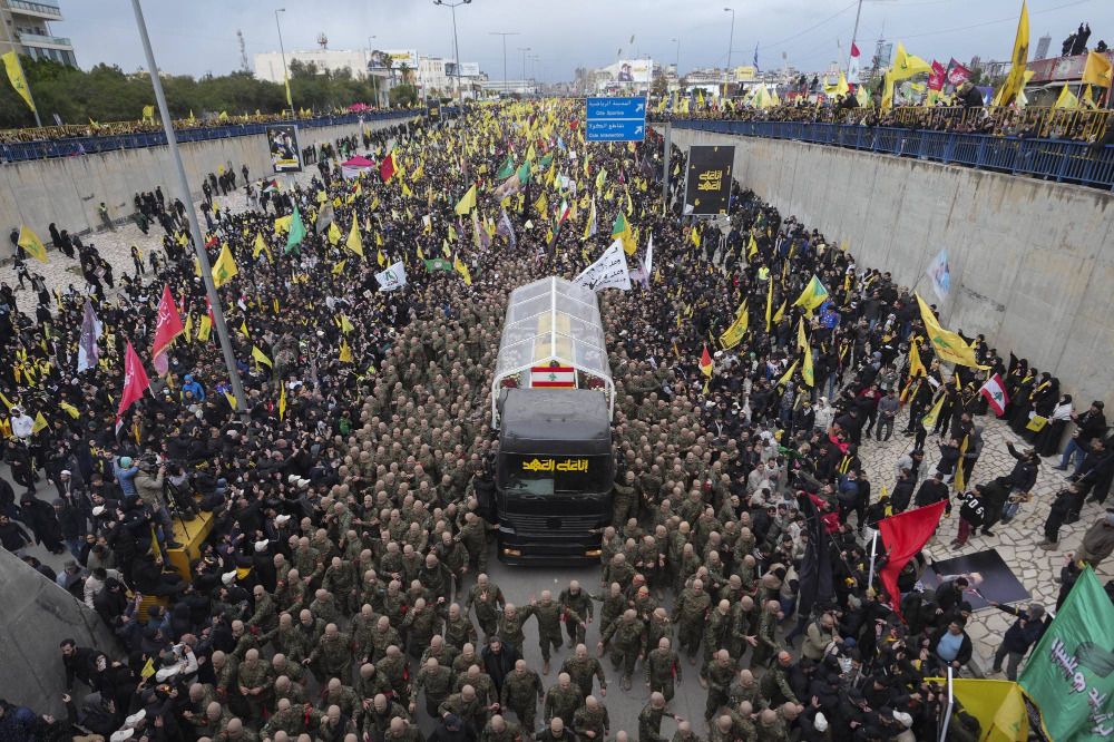 الصورة : نعشا نصر الله وصفي الدين يشقان الجموع من المدينة الرياضية في بيروت باتجاه موقع دفن نصر الله على طريق المطار (أ.ب)